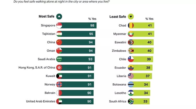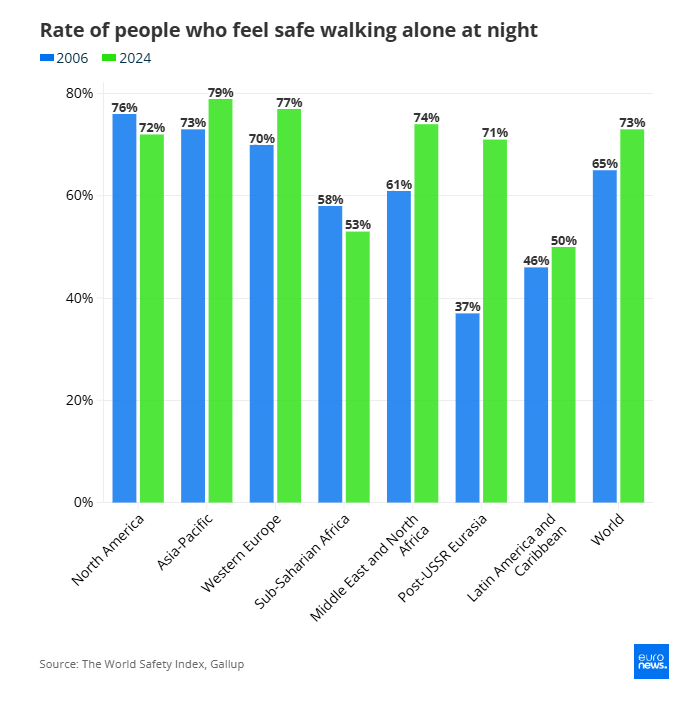 Σε παγκόσμιο επίπεδο, το 73% των ενηλίκων δηλώνει ότι αισθάνεται ασφαλές να περπατά μόνο του τη νύχτα στην πόλη ή την περιοχή όπου ζει, το υψηλότερο ποσοστό που έχει καταγραφεί από τότε που η Gallup ξεκίνησε τη μέτρηση το 2006. Η αύξηση φτάνει το 13% την τελευταία δεκαετία.