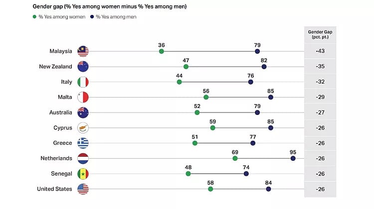 Πέντε από τις δέκα χώρες με το μεγαλύτερο χάσμα φύλου βρίσκονται στην Ευρωπαϊκή Ένωση, μια ένδειξη ότι το πρόβλημα δεν περιορίζεται σε αναπτυσσόμενες περιοχές ή σε κοινωνίες με αδύναμες θεσμικές δομές.