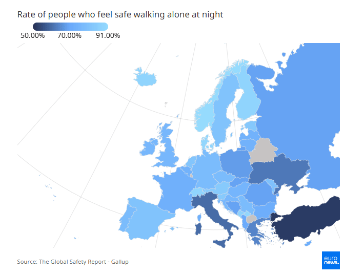 Οι Ιταλοί και οι Γάλλοι αισθάνονται λιγότερο ασφαλείς να περπατούν μόνοι τη νύχτα σε σχέση με δεκάδες άλλες χώρες, ακόμη και με κράτη όπως το Ιράκ, η Ρουάντα και το Μπαγκλαντές, σύμφωνα με τη νέα έκδοση της Global Safety Report 2025.